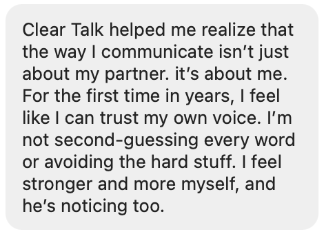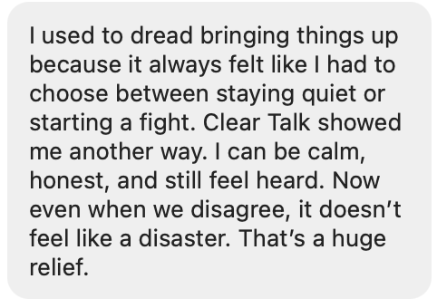 "Before Clear Talk, I’d either blow up or shut down, there was no in between. Now I can pause, say what’s real without making it a huge drama, and actually feel good about the outcome afterward. My boyfriend told me last week, ‘You’re easier to talk to now, and I feel closer to you.’ That’s all I needed to hear."