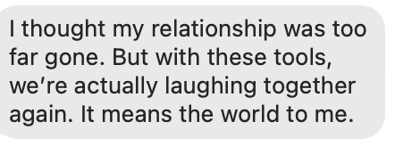 "I’m a mom, I run a business, and the last thing I had energy for was another long conversation that got nowhere. But I also couldn’t stand feeling disconnected from my husband. Clear Talk made it so that now, even when we don’t agree, we stay connected. That’s worth everything to me."