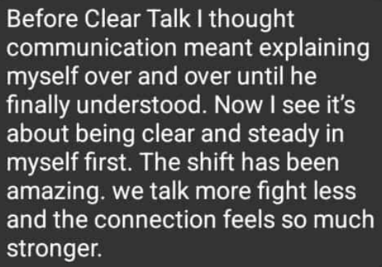 "After 28 years of marriage, I thought maybe this is just what happens. You stop talking, you start living separate lives under the same roof. Clear Talk reminded me that it’s never too late to start showing up differently. I didn’t just learn new phrases, I learned how to listen to myself again. My husband noticed the shift right away."